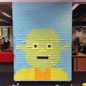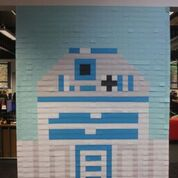 “Per realizzare un enorme murale ispirato a “Star Wars”, continuano a dirci i fautori di questa iniziativa, abbiamo scelto tre colonne e una parete adiacente come “tela” per i nostri sforzi artistici. Il primo passo è stato misurarle. Ogni Post-It misura 76X76mm e, dato che una parete è circa 254×190,5cm, abbiamo diviso l’immagine in 25 righe e 33 colonne per un totale di 825 Post-It. Da questi calcoli abbiamo creato al computer una griglia sulla quale potevamo disegnare i vari personaggi. All’inizio abbiamo fatto parecchie bozze per i vari personaggi e avremmo voluto rappresentare tutti i protagonisti della saga. Alla fine, abbiamo dovuto prendere una decisione in base ai colori dei Post-It maggiormente diffusi. Il disegno finale era molto simile all’immagine di R2-D2 e rappresentava in maniera quasi perfetta il risultato finale in scala ridotta. Una volta raccolti tutti i disegni ed i Post-It necessari, ci siamo messi al lavoro!”.