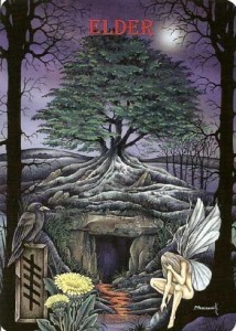Esiste una credenza contadina secondo la quale Giuda si sarebbe impiccato a un albero di sambuco: da allora le sue bacche diventarono così amare da non poter essere mangiate. L’essenza del sambuco è mutevole, inafferrabile. È un’essenza in cui il volto della Strega oscura e quello della Fata luminosa si uniscono in un unico essere dalla magia ambivalente, pericolosa da un lato e estremamente benevola dall’altro. La Strega che lo abita ricorda i rapaci notturni, la cui vista è in grado di penetrare il buio più nero, e l’albero stesso forniva, con la sua linfa, una magica sostanza che avrebbe mostrato la verità oltre il visibile. Il sambuco cela tra le sue venature e i solchi della sua ruvida corteccia gli Occhi Nascosti, quelli in grado di vedere oltre il velo della materia. Il suo Dono è la Visione Divina, la magia che fa scostare i veli della nebbia e fa intravedere il Mondo al di là di essi e le eteree creature che lo abitano.» (2)